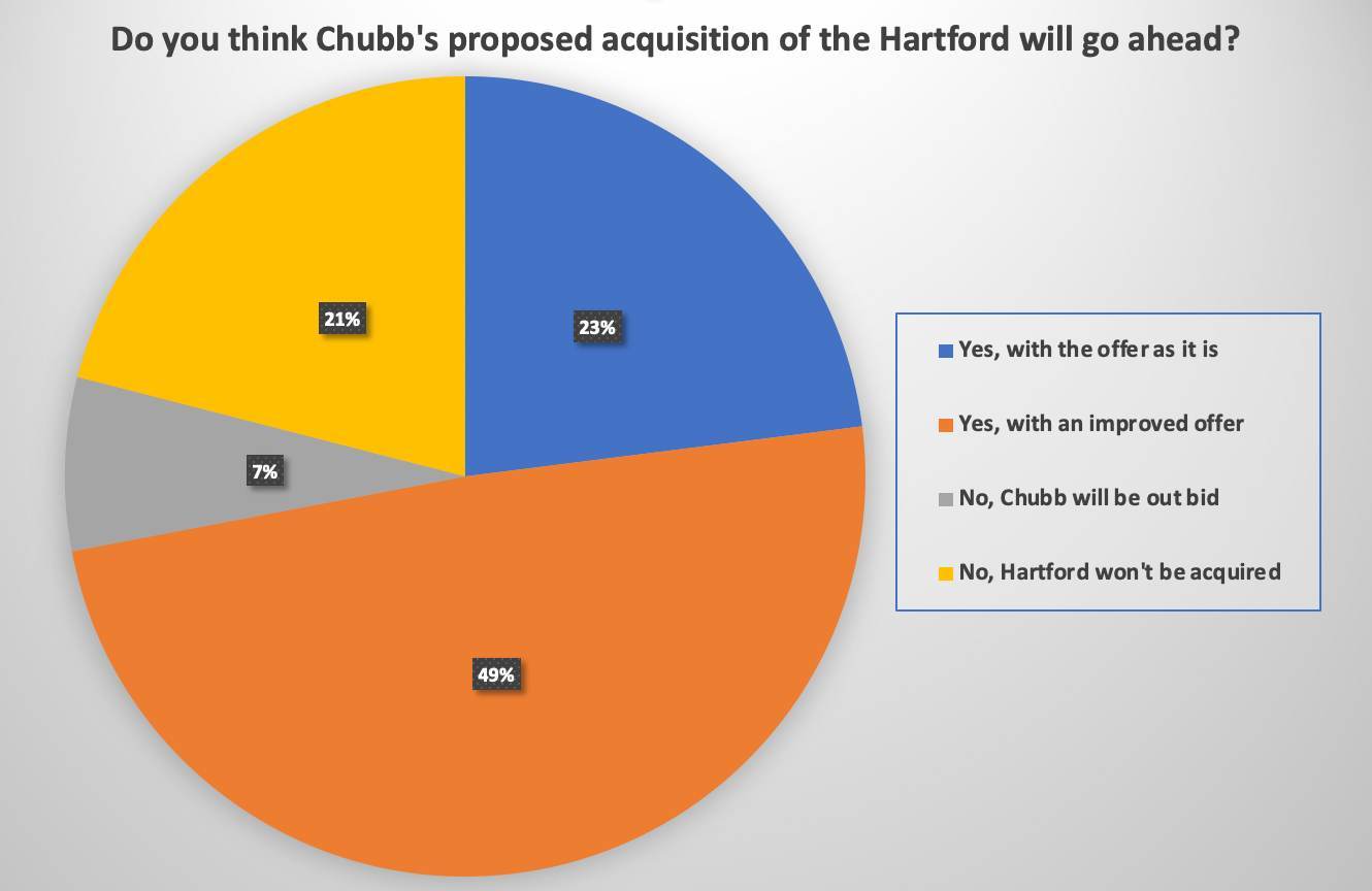 Having approached our industry contacts following news that Chubb was lining up an acquisition attempt for rival insurer Hartford, Reinsurance News found 49% believed a higher asking price would be needed for the mega transaction to go ahead.