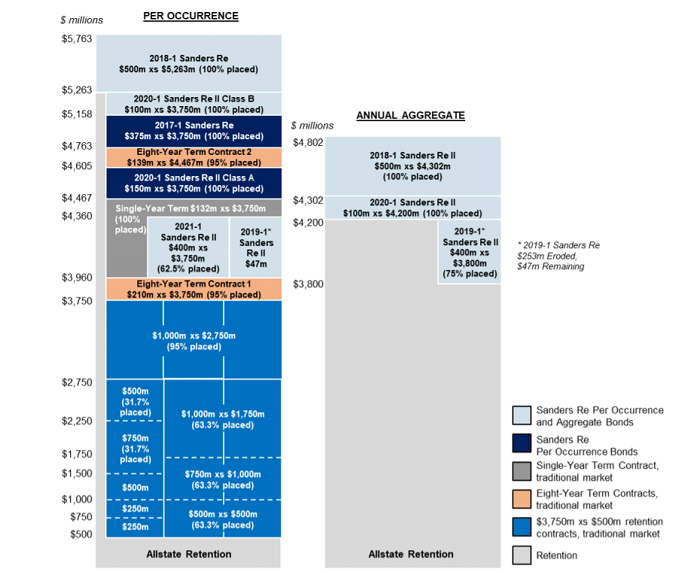 In order to replace this protection, Allstate has since filled out the gap with $250 million of coverage from a new 2021-1 Sanders Re II bond, and a single-year term contract that provides a $132 million limit in excess of the minimum $3.750 billion retention.