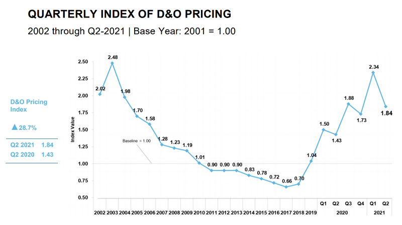 The pricing index of D&O insurance increased to 1.84 from 1.43 in the previous quarter, while the average cost of $1 million in limits increased by 28.7% compared to the prior year quarter.