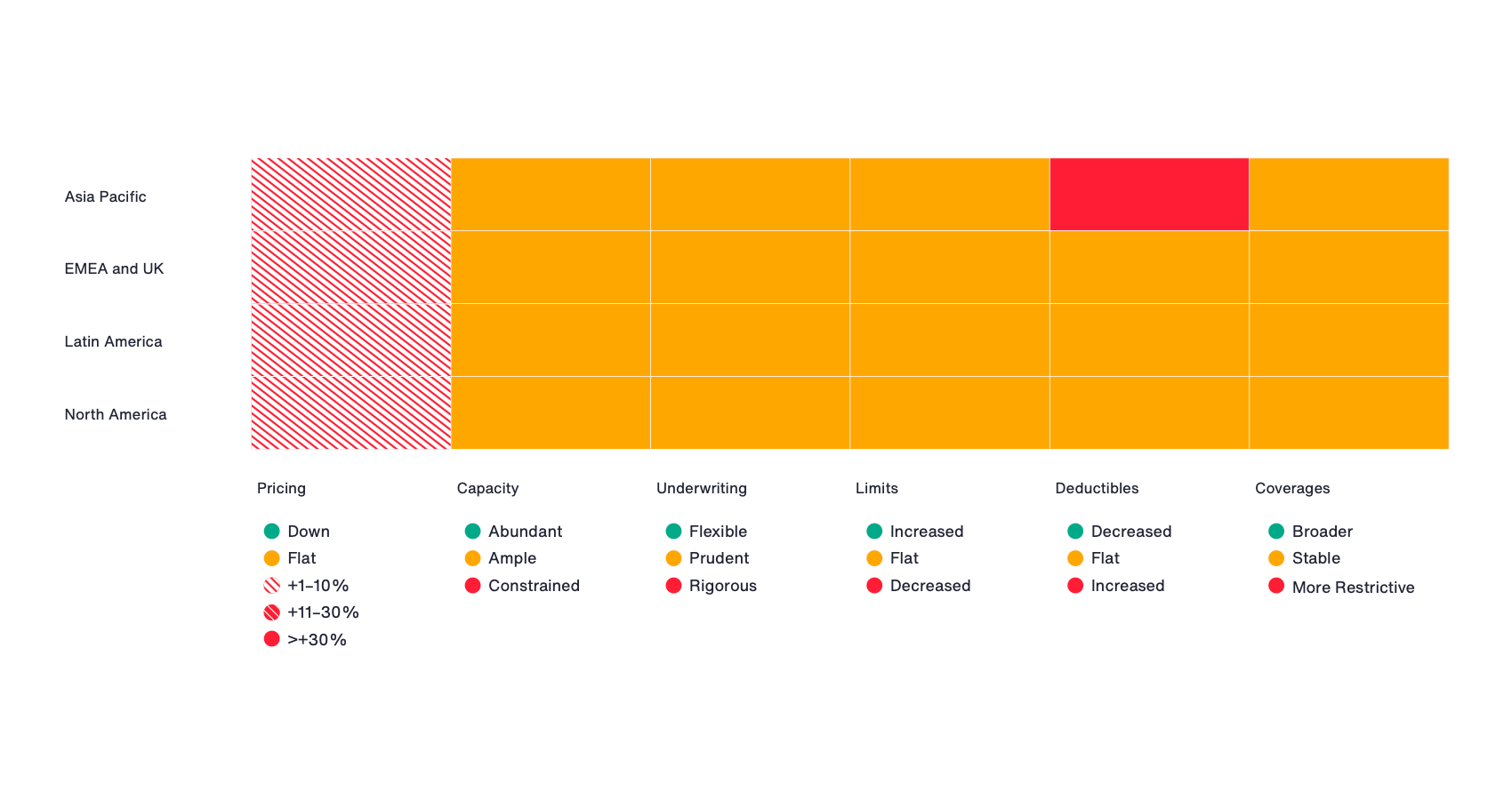 Insurers maintained their focus on disciplined risk selection through robust underwriting practices supported by detailed risk information. Property underwriters paid close attention to valuations and the potential impacts of Natural Catastrophe exposures.
