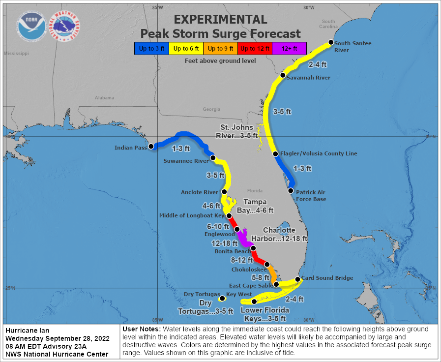 Below is the latest peak storm surge graphic from the NHC. This shows a surge of up to 18 foot as possible and widely above 6 foot on the central west coast.