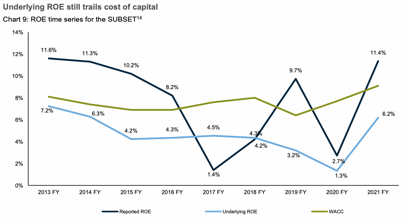 However, the report argues that the industry’s underlying RoE does not yet meet its cost of capital, which exceeded 8% in 2021, as shown in the chart below.