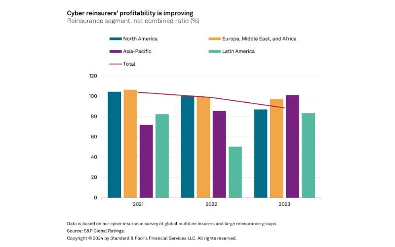 The net combined ratio improved to 89% in 2023, compared to 99% in 2022 and 104% in 2021, a trend that S&P anticipates to continue in 2024, leading to currently sustainable margins for cyber reinsurers.