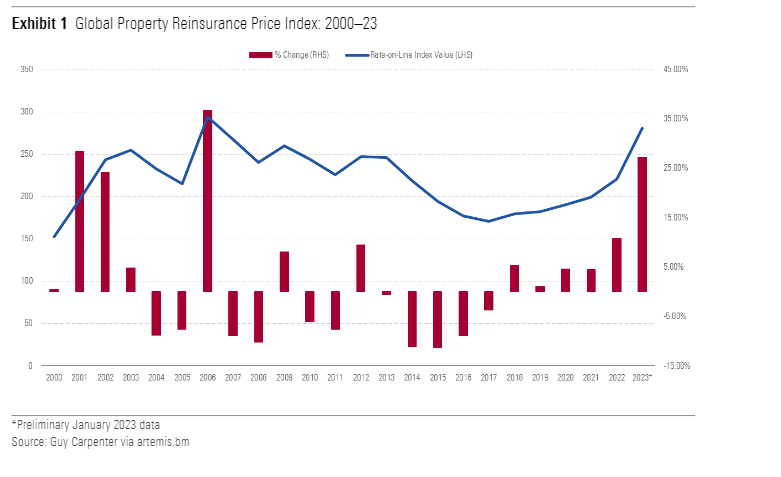 As noted by analysts, the last six years have seen increases in reinsurance prices, but none were as significant as the 27% increase recorded during the January 2023 property catastrophe reinsurance renewals, as highlighted by the Guy Carpenter Global Property Catastrophe Rate-On-Line Index.