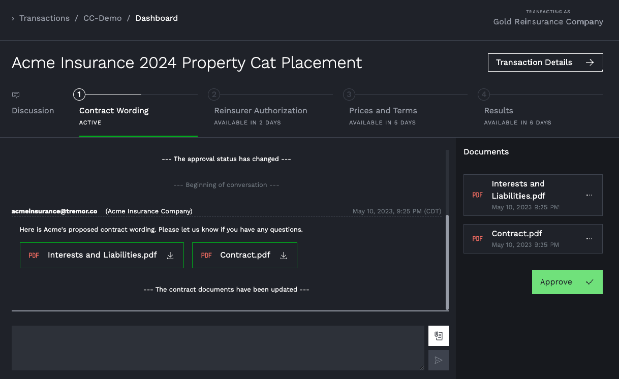 When cedent and reinsurer agree to terms, they both click to approve the contract wording, immediately making the reinsurer eligible to authorize bindable capacity for the placement on Tremor.